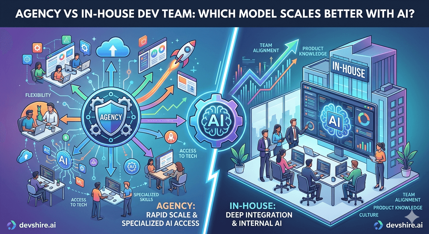 When AI is in the picture, agencies win on speed and cost for defined project work, while in-house teams win on long-term product ownership and institutional knowledge. The break-even point has shifted: in-house becomes cost-effective at around 18+ months of sustained dev work, up from the traditional 9–12 month estimate. For most early-stage teams, starting with an AI-powered agency and converting to in-house after product-market fit is the smarter sequence.