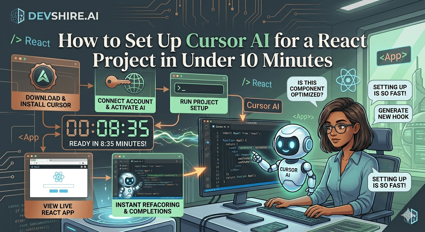 Most Cursor AI tutorials spend 20 minutes on settings menus before you write a single line of code. This guide skips that. You'll have Cursor AI running on a React project in under 10 minutes — and you'll understand the two configuration decisions that actually matter for React development. The rest is defaults. Cursor's install-to-useful time is genuinely fast, but only if you know which steps to skip and which ones to get right the first time.