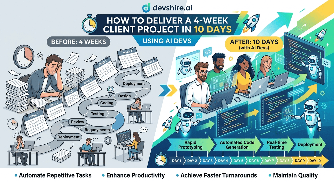The client gave you four weeks. You told them you'd aim for three. But with your AI-assisted developer on it, you shipped in ten days. That kind of delivery speed isn't luck — it's a process. And it's repeatable. The gap between a 4-week project and a 10-day delivery isn't just about having faster developers. It's about removing all the non-development friction that bloats every project timeline. Here's the exact playbook.