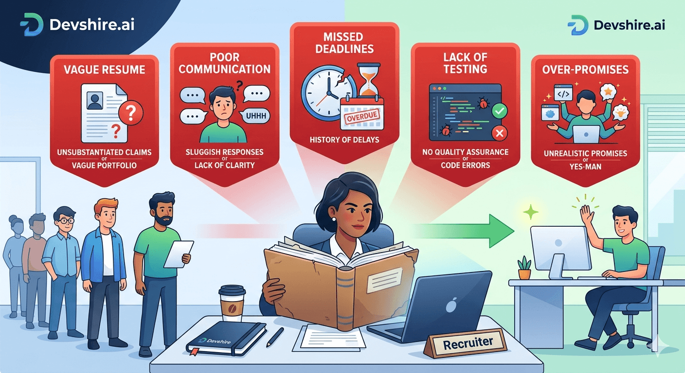 Most bad freelance developer hires are predictable. They leave signals in the first conversation — in how they respond to a brief, how they answer a scope question, how they describe their last client. The problem isn't that the signals are hidden. It's that most founders don't know what to look for until they've already wasted $15,000 and six weeks on the wrong developer. These are the patterns we've seen across 100+ developer placements at Devshire.ai. Some will save you a lot of money.