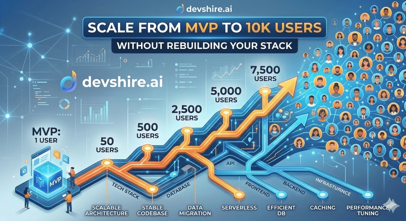Most MVPs built on React plus Node.js plus PostgreSQL scale to 10,000 users without a rewrite. The bottlenecks at each threshold are predictable: indexes at 500 to 2,000, N+1 queries at 2,000 to 5,000, Redis caching at 5,000 to 10,000.