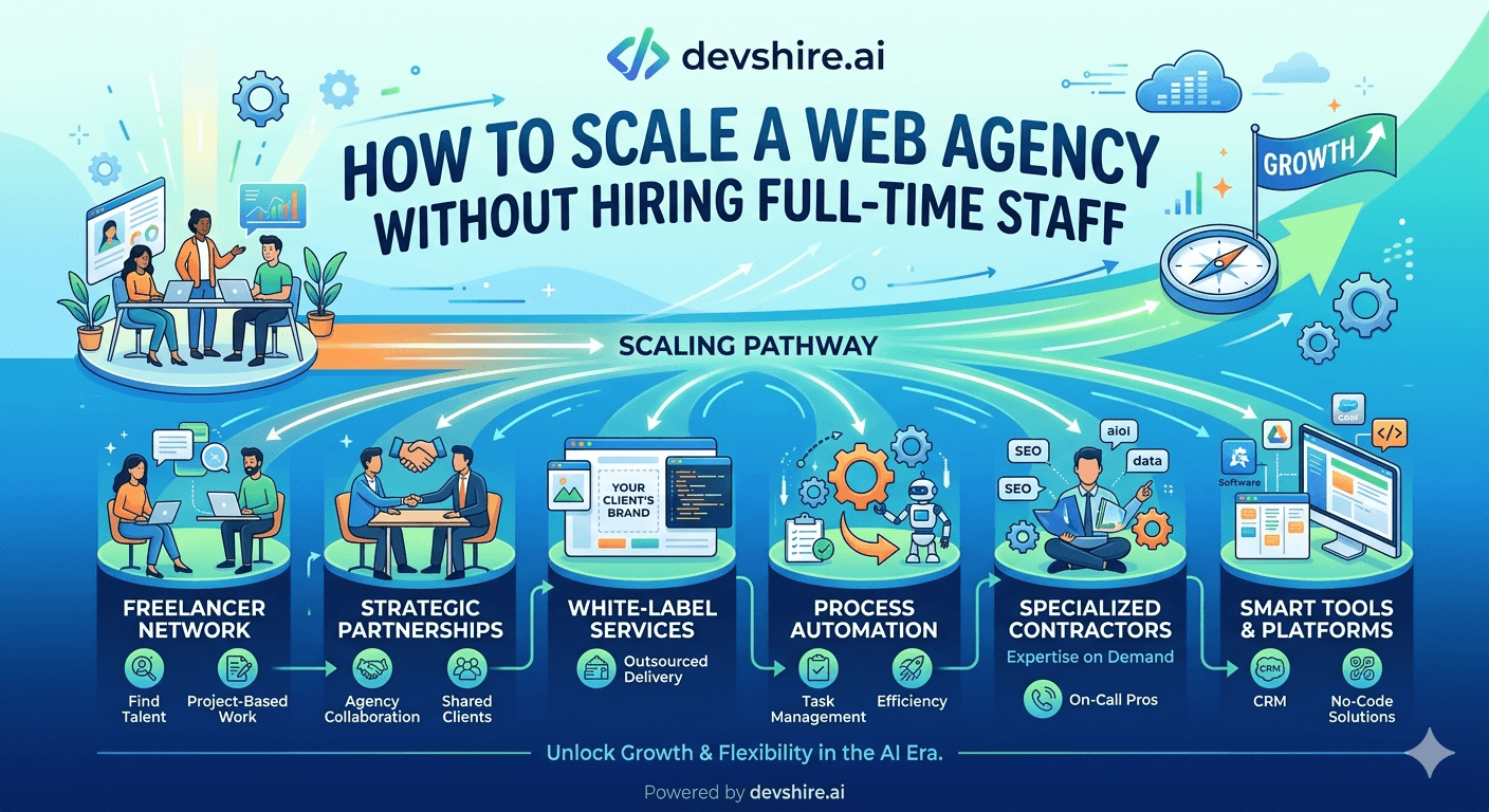 Web agencies scale without full-time staff by building elastic development capacity through staff augmentation platforms like Devshire.ai — adding AI-powered developers per project, releasing them when the project ends, and maintaining a core team of 2–3 account and project management roles full-time. This model allows agencies to take on 2–4× the project volume with no headcount risk. A 4-person agency (2 account managers, 1 founder, 1 full-time developer) can service 8–12 concurrent client projects this way, generating $80,000–$150,000 in monthly revenue with a lean structure.