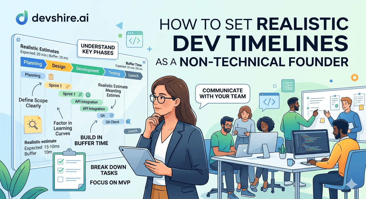 Your developer said two weeks. It's been five. And the explanation involves phrases like "unexpected complexity" and "integration issues" — which sound legitimate but you have no way to evaluate. This is the dev timeline problem that almost every non-technical founder hits. And it's almost never the developer being dishonest. It's almost always a combination of vague scope, optimistic estimates, and a founder who didn't know what questions to ask upfront. Here's how to fix all three before the next project starts.