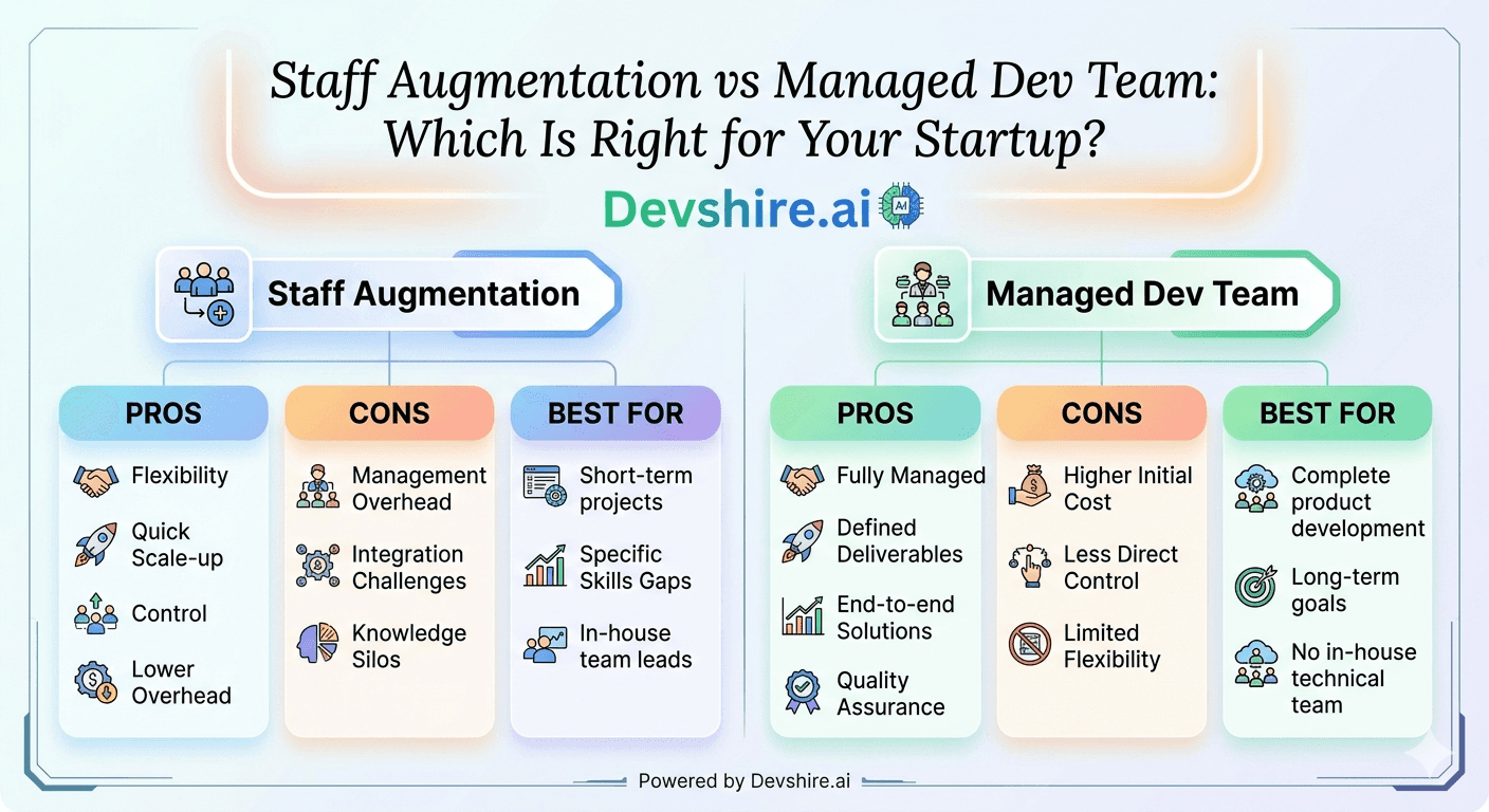 The managed team model was built for a world where one developer = one developer's output. In 2026, one AI-powered developer = 2–3 developers' output. That math makes staff augmentation through an AI-first platform like Devshire the default choice for most startup and agency use cases.