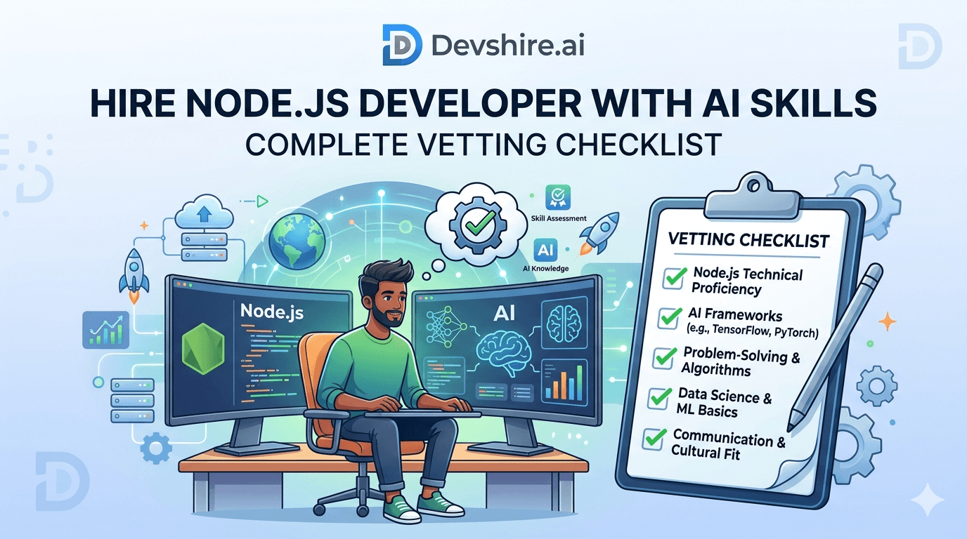A proper vetting process for AI developers covers four things: live AI toolchain proficiency, output validation habits, codebase review of AI-generated code, and async communication quality. Most platform vetting covers one of these four. Devshire.ai covers all four. The gap between a properly vetted AI developer and one who passed a generic coding screen shows up in your codebase by week 2 — and it almost always shows up as AI-generated bugs that passed PR review because nobody was trained to look for them.